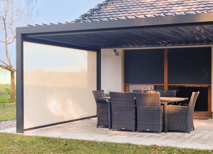 Myslet se vyplácí i na boční zastínění pergoly, které spolu s ochranou před větrem a deštěm poskytuje ochranu před ztrátou soukromí. V tomto ohledu se spolu s bočními markýzami nabízejí speciální screenové rolety vyráběné ze speciálních tkanin kombinujících vysokou odolnost s funkční propustností, která nejenže přispívá k navození příjemné atmosféry pod pergolou, ale také prostor zcela nezatemní a uživatele nepřipraví o výhled ven. K tomu se screenové látky vyznačují vysokou odolností proti povětrnostním vlivům, výbornou barevnou stálostí a dlouhou životností.